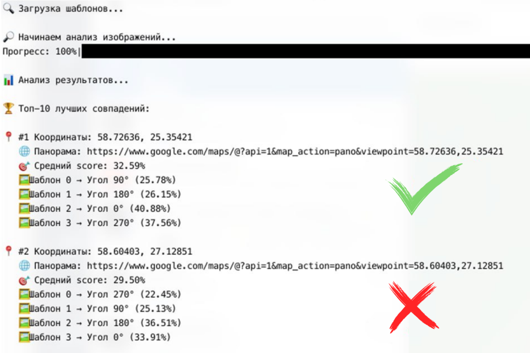 В итоге бот пробегается по всем местам, делает фотки с четырёх сторон и сравнивает их с шаблонными изображениями. Все результаты сортируем, и после выполнения нужное место оказалось на первом месте, набрав 32,5% схожести. На втором и третьем местах — по 29%, далее — ниже 25%.